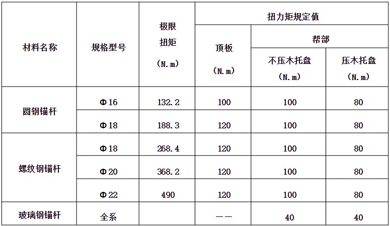(一)表中扭力矩規(guī)定值為要求支護(hù)質(zhì)量的數(shù)值,各礦可根據(jù)礦內(nèi)實際情況對錨桿扭力矩值做適當(dāng)調(diào)整,但不得低于此表規(guī)定的數(shù)值。