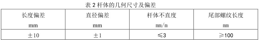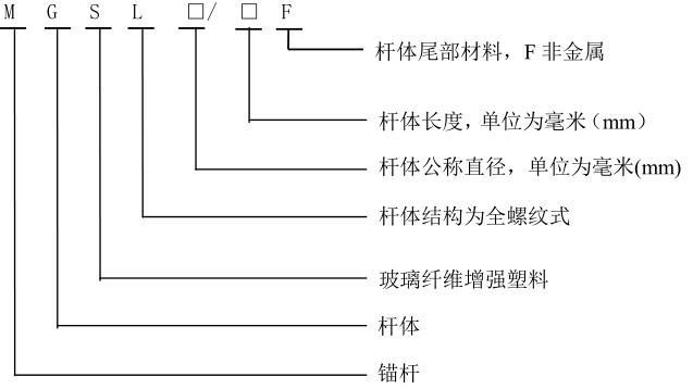 示例:公稱直徑為20mm,長度為1800mm,桿體尾部結(jié)構(gòu)為非金屬材料的全螺紋式樹脂錨桿玻璃纖維增強(qiáng)塑料桿體,可標(biāo)記為MGSL20/1800F。