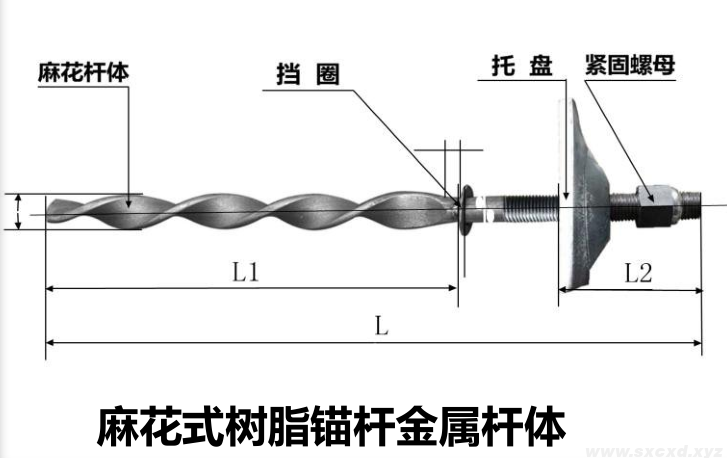 麻花式樹脂錨桿( headed twist bars ) 在金屬桿體端部加工成一定規(guī)格的左旋麻花形錨頭, 尾部加工成可上螺母的螺紋。